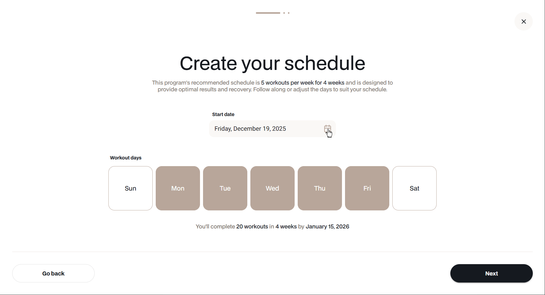 Yes — you can freely reschedule program workouts. Head to your calendar, select the workout and move it to a new date. Programs are designed to be completed as prescribed, but you can skip workouts if needed. However, to earn a program completion achievement badge, you must complete all workouts in a program, so you will need to reschedule the skipped workout.