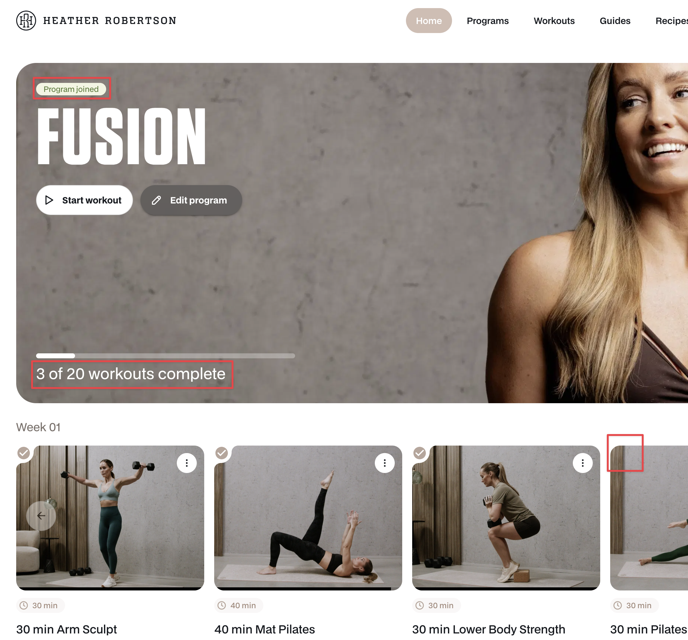 A program workout is marked complete when you finish the workout video up until the player reaches the cool down marker. Once the program workout is completed, it will get a completion checkmark and your overall program progress updates. Progress will display on your home page (e.g. 1/20 workouts).