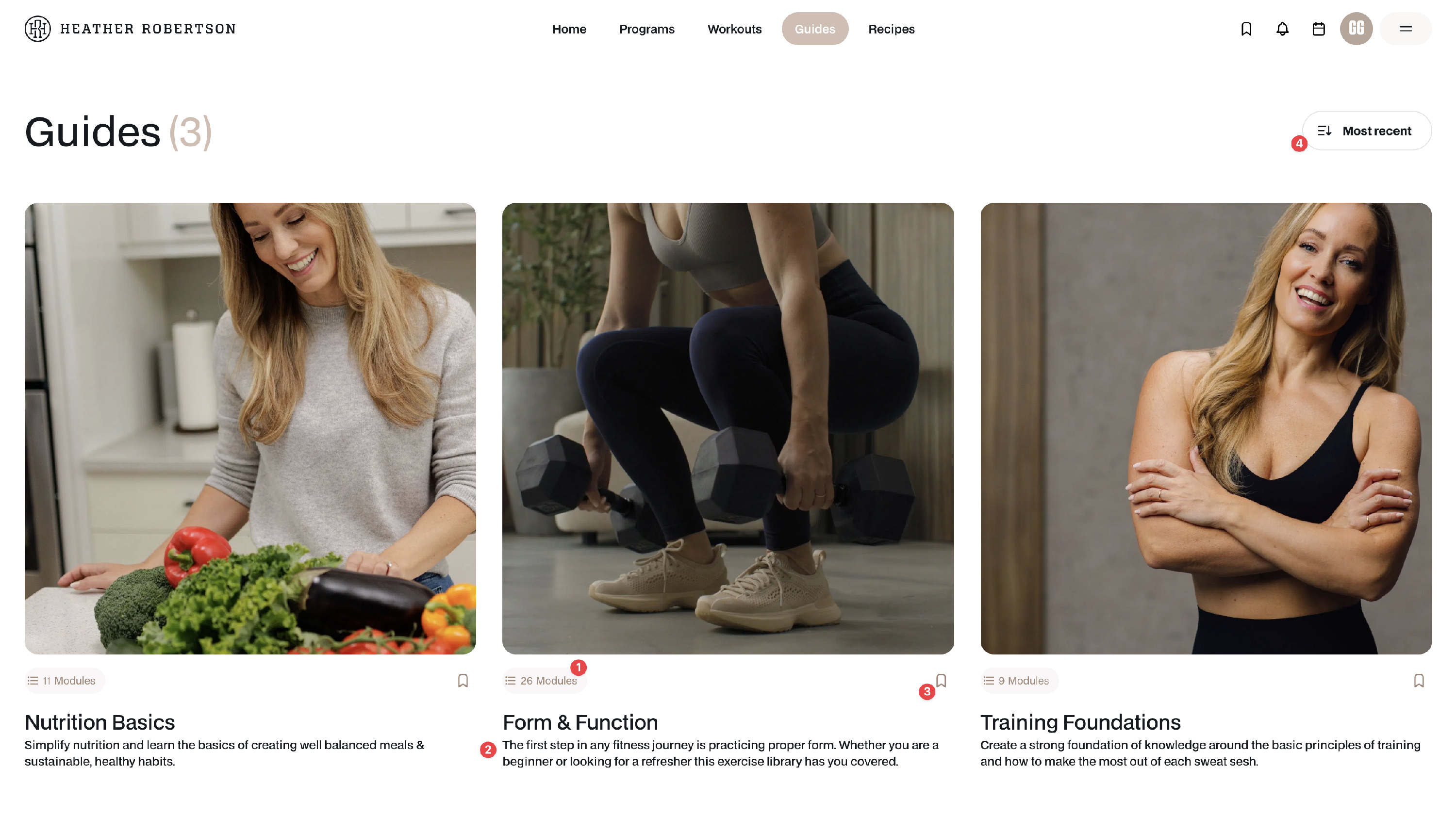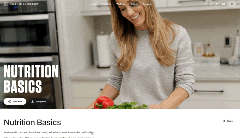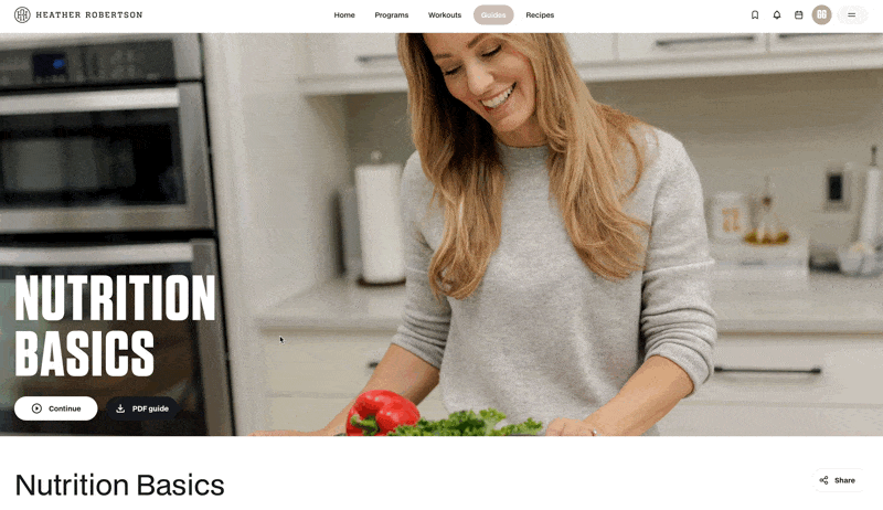 Guides are your go-to resource for building a strong foundation for your wellness journey. Designed by Heather, these guides are made up of structured modules that walk you through the essentials like how to fuel your body for workouts and how to move with proper form.