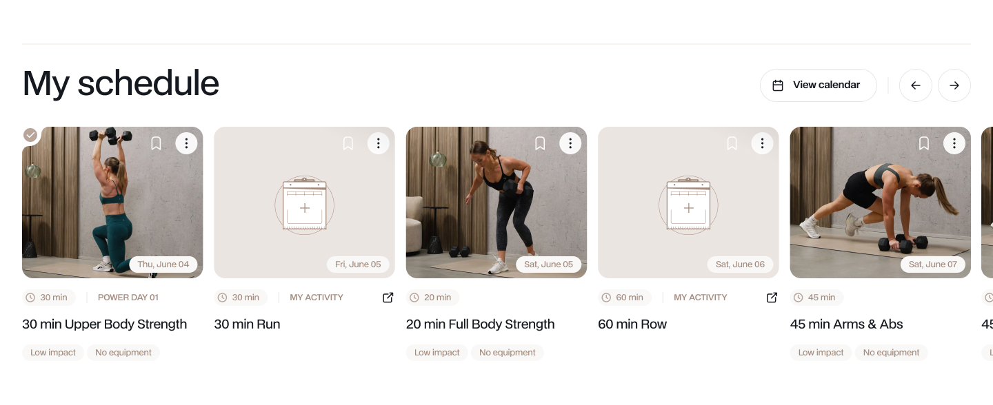 The My schedule section shows upcoming scheduled workouts and activities without having to leave your homepage. Use the arrows to move between dates or scroll through on a mobile device. All types of workouts appear here together: program sessions, individually scheduled workouts, and any of your activities you've logged. Each card shows the workout name, the scheduled date, and a label so you can see what type it is at a glance.