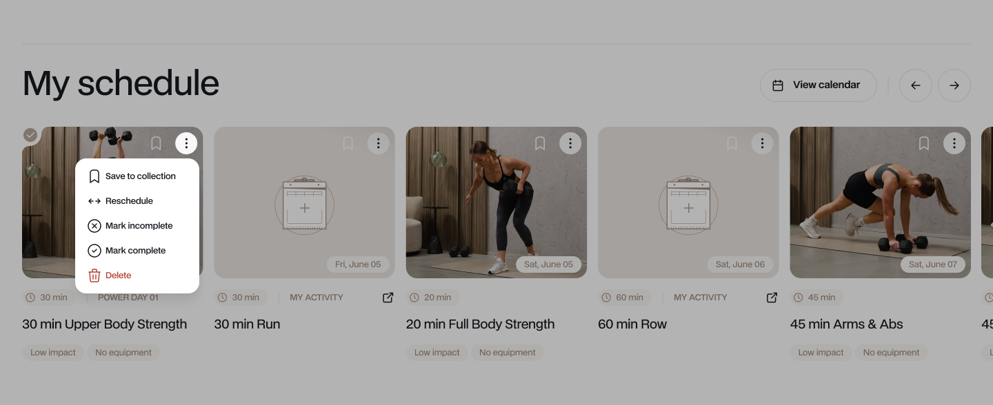 Your at-a-glance view of everything coming up. The My schedule section shows your upcoming workouts in one scrollable carousel. This article covers how to read your schedule, manage planned workouts, and access your full calendar.