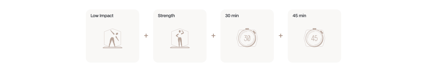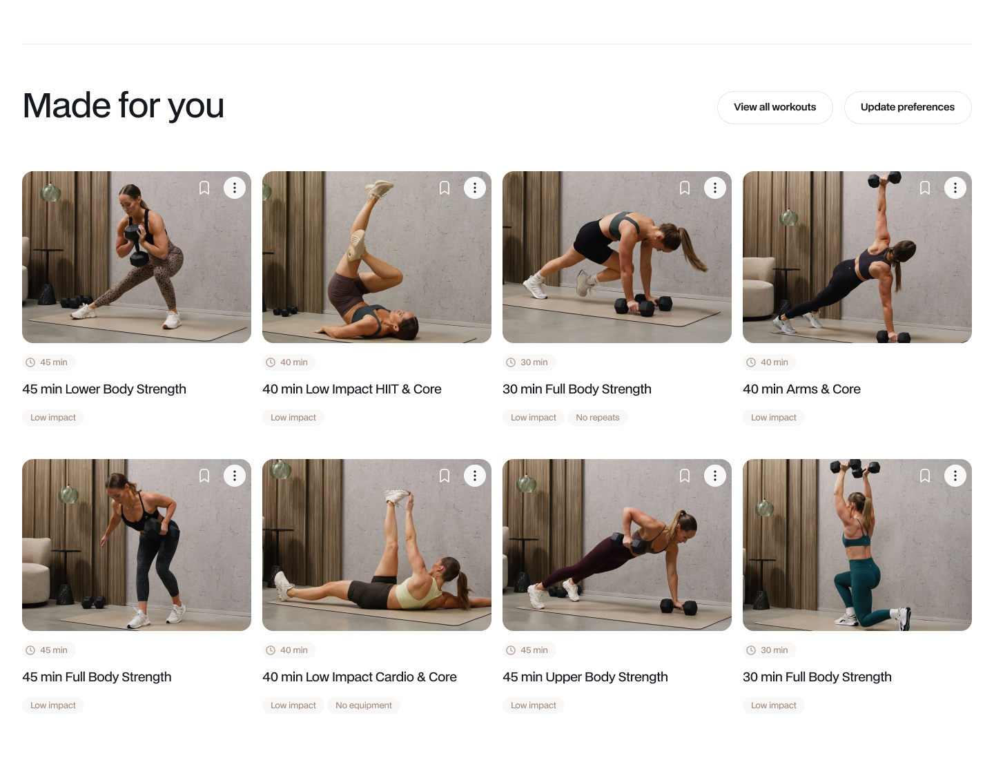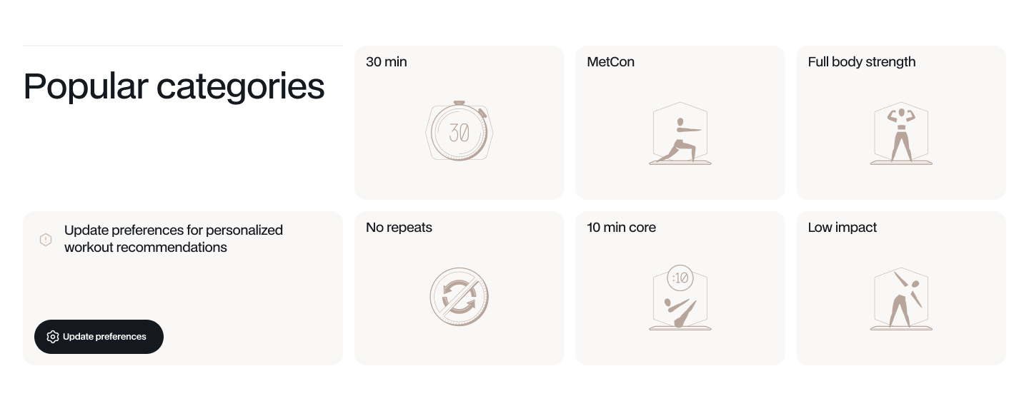 If you haven’t set your workout preferences yet, your homepage shows Popular categories instead of Made for you. This gives you a quick way to explore the workout library by popular themes while you find your footing. Select any category tile to browse all workouts matching that theme.